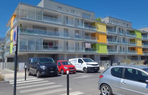 Parking souterrain sécurisé situé Porte de France à Saint-genis-Pouilly. L'immeuble se trouve proche du grand rond-point à l'entrée de la ville.